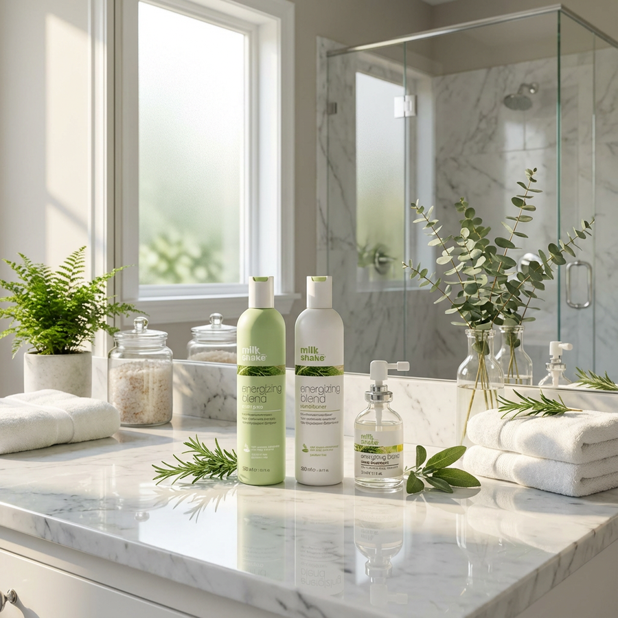 milk_shake Energizing Blend هي مجموعة متكاملة للشعر الخفيف واللي بترقّق والضعيف، مصممة لتنشيط فروة الراس وتحسين الدورة الدموية الدقيقة عشان تدعم نمو شعر صحي وتزيد الإحساس بالكثافة والامتلاء مع الوقت. بتتكون من شامبو + بلسم + علاج فروة (تكثيف)، وكلهم غنيّين بمستخلصات عضوية مثل إكليل الجبل والميرمية وخلطة Fioravanti النباتية، مع بانثينول (B5) ومكوّنات منعشة زي الأوكالبتوس والزيوت الأساسية. النتيجة: فروة أنشط، شعر أنعم بدون ما يثقّل، ومظهر أكثف ولمعة أحلى—خصوصًا مع المساج الخفيف والالتزام بالروتين.