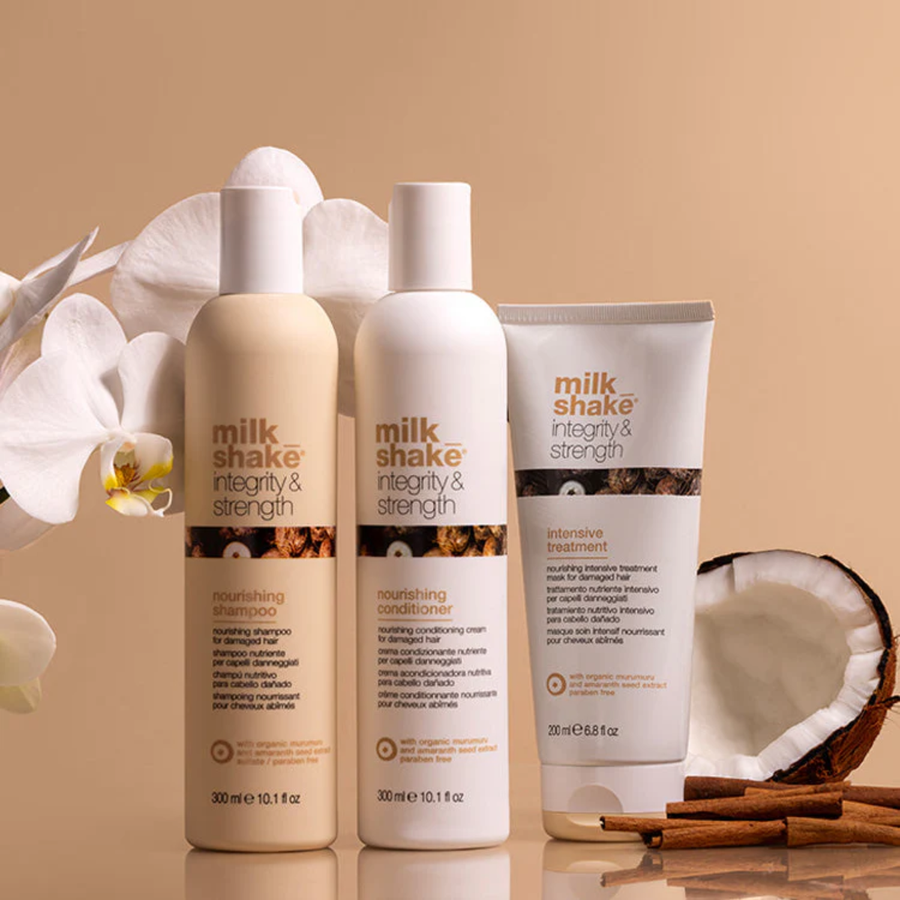 باكج milk_shake Integrity & Strength لترميم وتقوية الشعر الجاف والمتضرر. روتين احترافي يعيد القوة والمرونة واللمعان بتركيبة غنية بزبدة المورومورو، وزيت الأرجان.